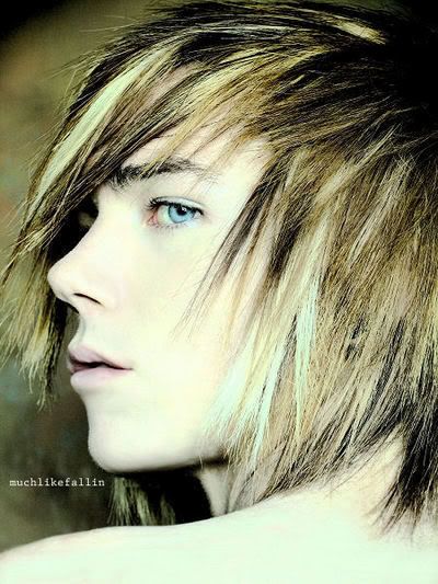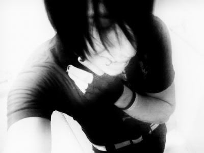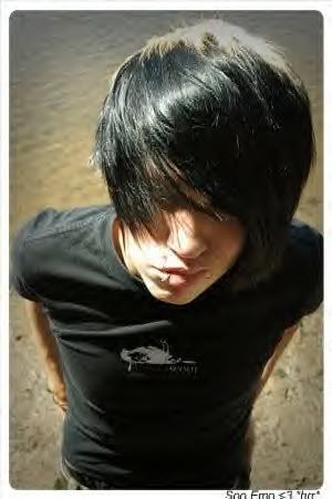 long, sweeping bangs, black hair teased in back, and heavy eyeliner